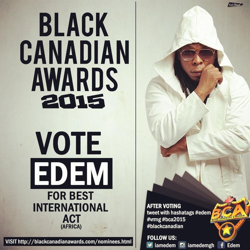 Ghanaian Rapper, Edem has been nominated for Best International Act-Africa at the 2015 Black Canadian Awards. He was nominated alongside Davido (Nigeria), Mafikizolo (South Africa), Yemi Alade (Nigeria),Eddy Kenzo (Uganda),Oritse Femi (Nigeria), and Teeyah (Ivory Coast).